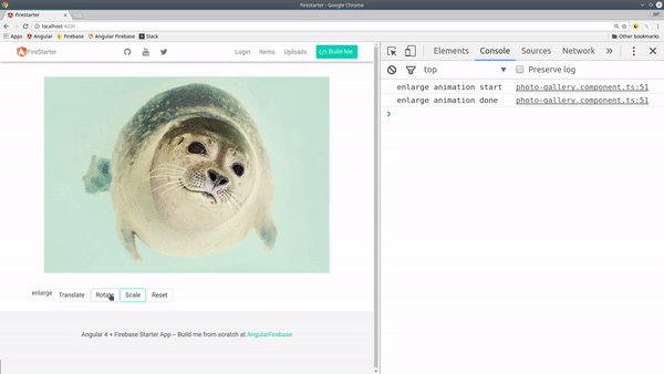 Now let’s build an animation that can move between multiple states. This will translate (move), rotate (spin), and scale (enlarge) the the image around the screen. Notice how I am using the wildcard transition `* => *` to apply the same transition settings to all states.