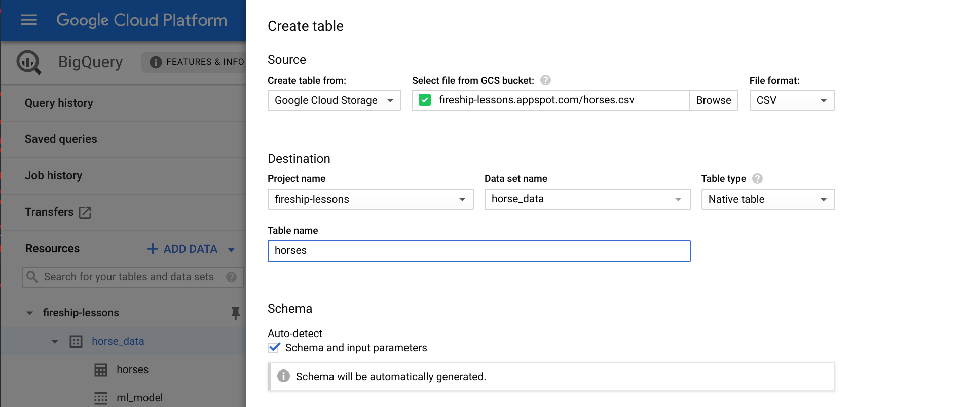 Now that you have a dataset, you can start adding tables to it. Tables represent data that you query using SQL. You can define your own schema manually, but BigQuery can autodetect the schema of CSV files based on the header row and a random sample of rows. Click Create Table and reference the data in the storage bucket with the following options.