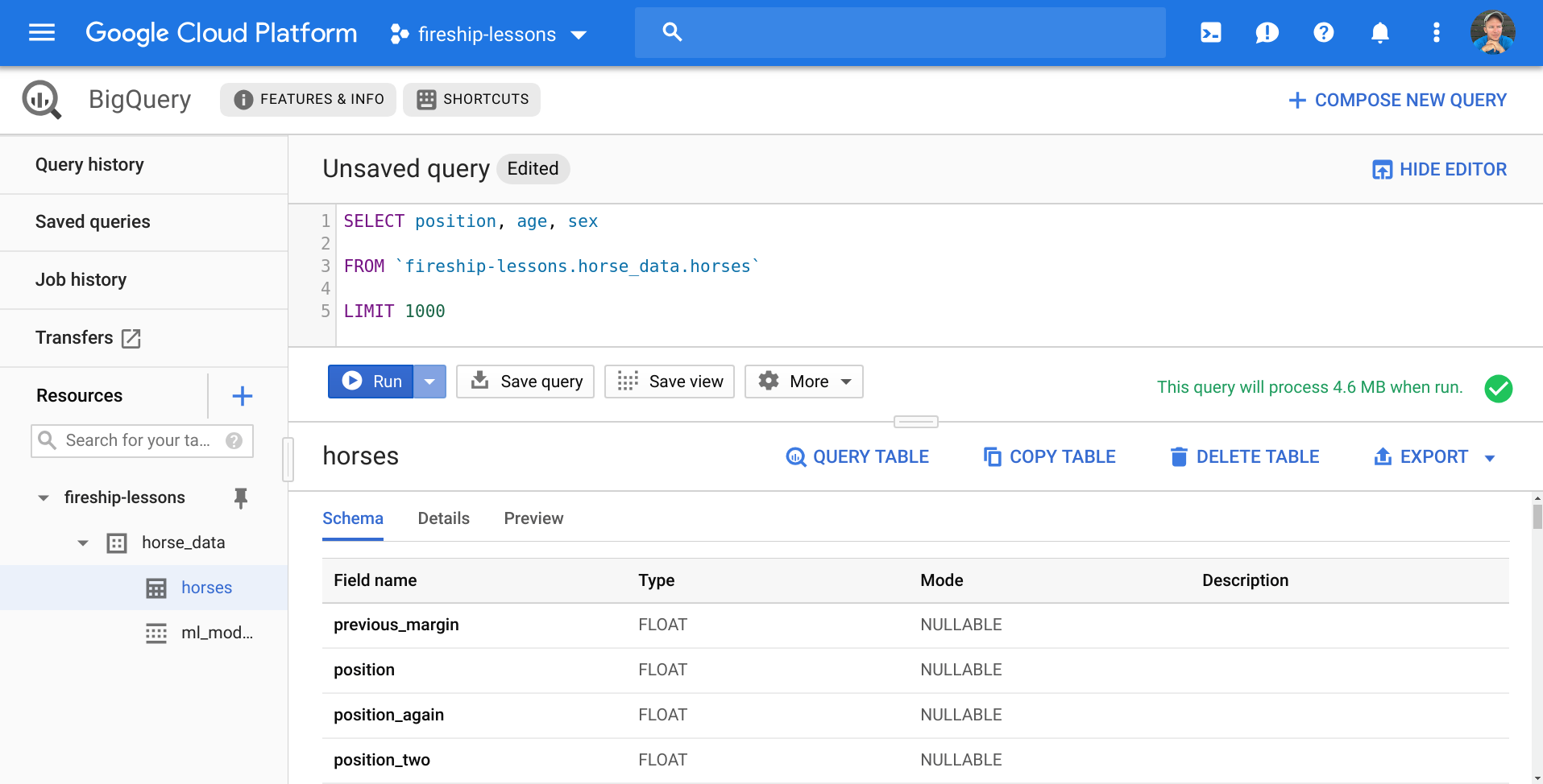 The end result should be a table that looks just like the original spreadsheet. Enter a Standard SQL Query in the console to try it out. In this dataset, the position value represents a horse’s finishing position in a race, which is what we want to predict.