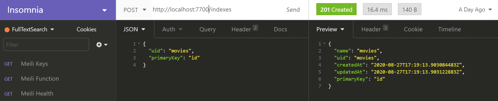 Create an index for searchable content. You can run a cURL command or use a HTTP client like Postman or Insomnia.