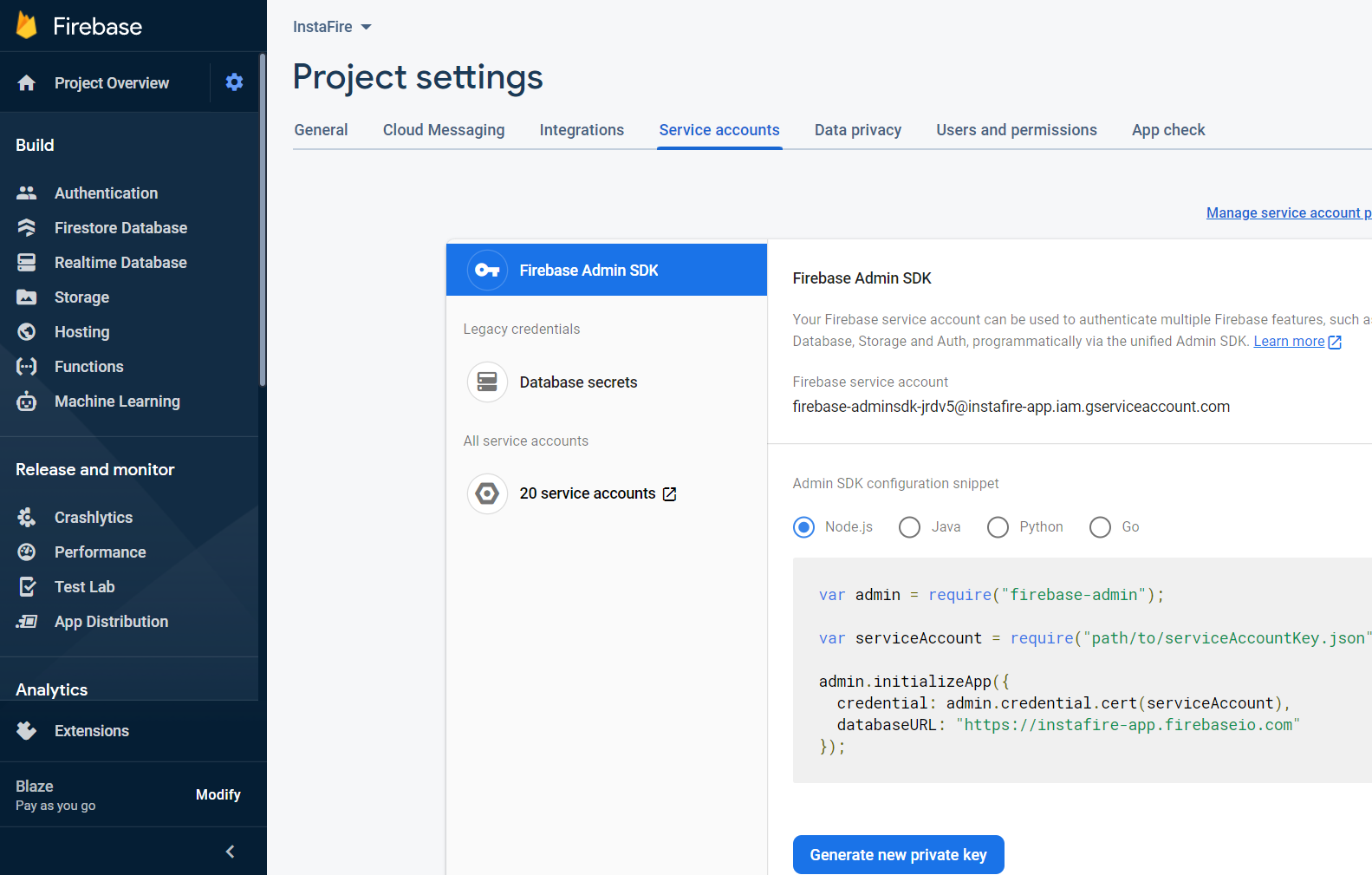 Firebase Admin requires us to authenticate the server. Download your service account from the Firebase console and save it as service-account.json in the root of the project. ⚠ Keep this file secret!